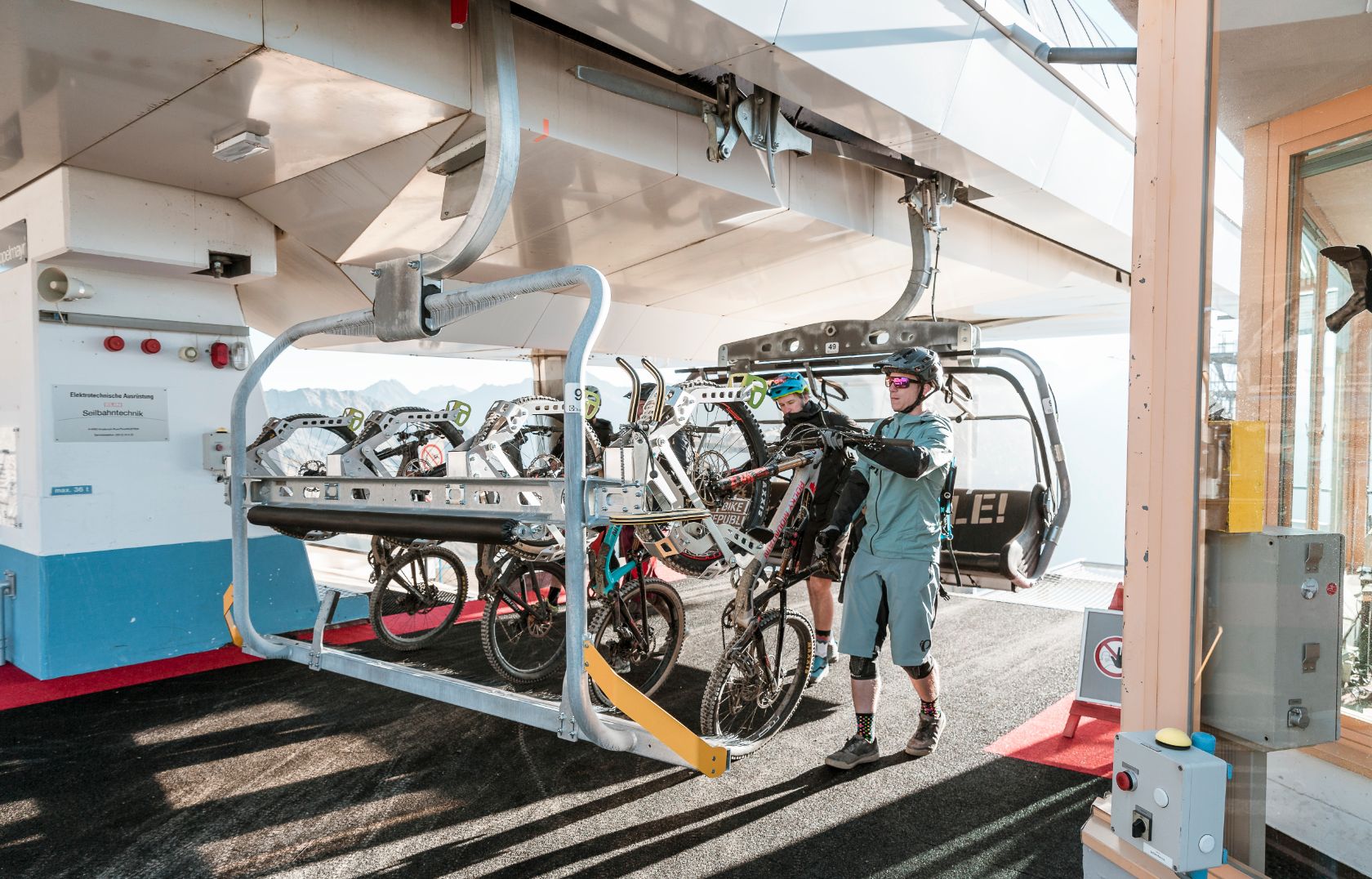 In the BIKE REPUBLIC SÖLDEN the mountain gondolas of Gaislachkogl and Giggijoch take the Bike Republic citizens up to the mountain peaks quickly and comfortably. The link between the two giant biking area is the 6-seater Langegg chairlift that plays a pioneering role in Austria thanks to its special, high tech transport solution for bicycles.