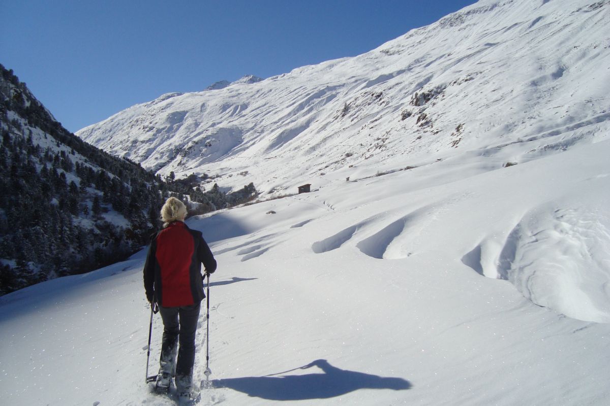 Das Rundum im eigenen Tempo entdecken. Am besten gelingt das von Zwieselstein aus mit einer gemütlichen Schneeschuh- oder Winterwanderung. In alle Himmelsrichtungen führen von hier Winterwanderwege und Steige durch verschneite Wälder und entlang rauschender Flüsse. Nur das Knirschen des Schnees unter den Füßen unterbricht die Stille der Natur.